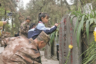 退役軍人和少先隊(duì)員對烈士墓碑進(jìn)行描紅維護(hù)。