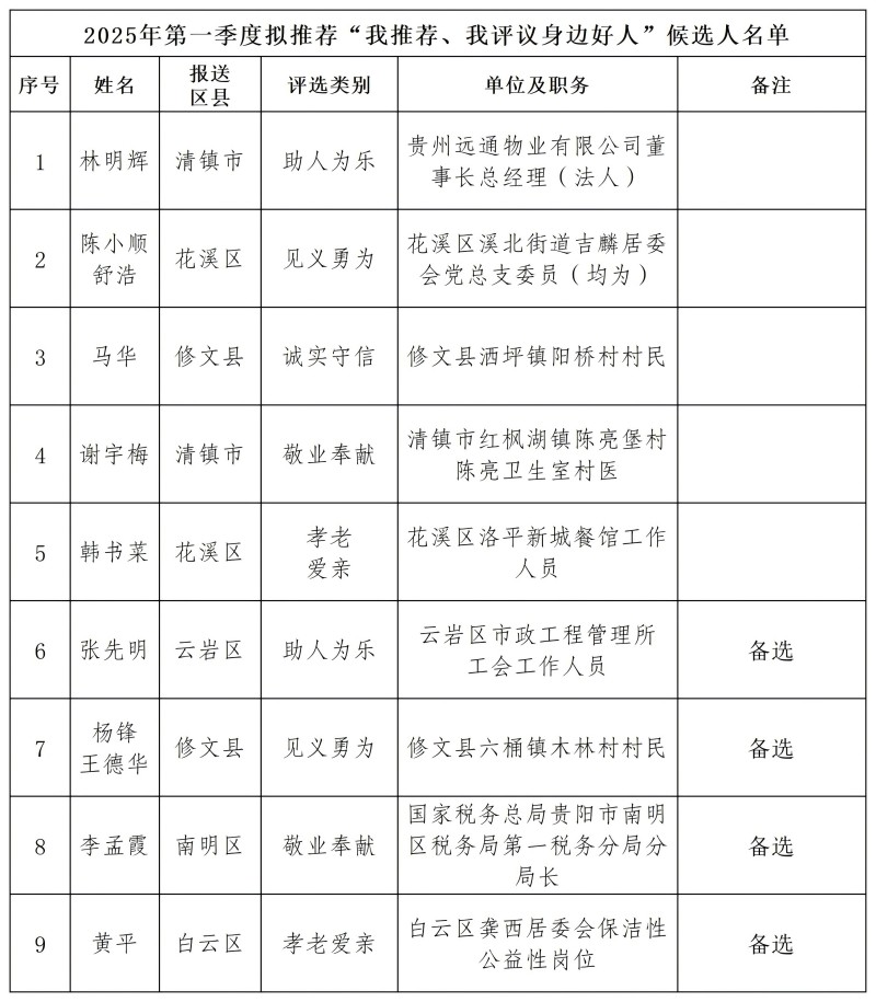 根據(jù)《關(guān)于開展貴州省“我推薦、我評(píng)議身邊好人”活動(dòng)的通知》(黔文明辦〔2021〕3號(hào))及相關(guān)工作要求,貴陽(yáng)市按照公平公正公開的原則,強(qiáng)化宣傳、積極發(fā)動(dòng),廣泛開展選樹推薦工作。按照逐級(jí)審核推薦原則,2025年第一季度共收到各區(qū)(市、縣)、市直各相關(guān)單位推薦材料37份,通過召開現(xiàn)場(chǎng)推薦會(huì)擬納入身邊好人數(shù)據(jù)庫(kù)9組11人,在一個(gè)年度推薦周期內(nèi),作為重點(diǎn)推薦對(duì)象。其中,擬推薦參評(píng)候選人5組6人、備選人4組5人,現(xiàn)予以公示,廣泛接受社會(huì)監(jiān)督,并按照程序向省級(jí)推薦報(bào)送參評(píng)。擬推薦公示名單如下:
